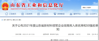 202203-17山東藥玻成功入選山東省新材料領(lǐng)軍企業(yè)50強(qiáng)山東省工信廳2021年1月28日發(fā)布了《2021年度山東省新材料領(lǐng)軍企業(yè)培育庫(kù)入庫(kù)名單》和《2021年度山東省新材料領(lǐng)軍企業(yè)50強(qiáng)名單》。