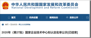 國家發(fā)改委關(guān)于印發(fā)2020年新認(rèn)定和全部國家級企業(yè)技術(shù)中心名單(第27批)的通知