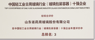 經中國日用玻璃協會綜合評價,山東藥玻被評為2019年度中國輕工業(yè)日用玻璃行業(yè)(玻璃包裝容器)十強企業(yè),年度評價中總排名第三名